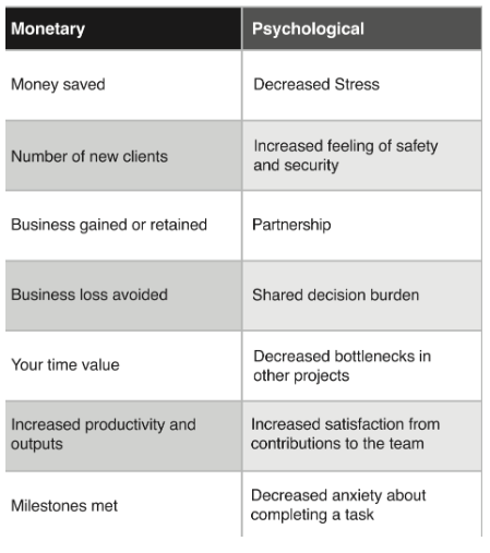 For example, maybe I am going to save three hours of my time, and my time is worth $350/hour, at the expense of $150/hour. Another valid perspective is that I am not going to see a financial ROI, but I will have the time to put my kids to bed. Or I am not going to see something tangible in terms of money or time, but I will avoid doing something I do not like, which will remove stress, which will make me happier, and which can feel like making an investment."