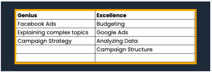 Genius: These are the activities you enjoy and want to keep developing. You could talk about them for hours and never get bored. This is the service you'll offer to clients.